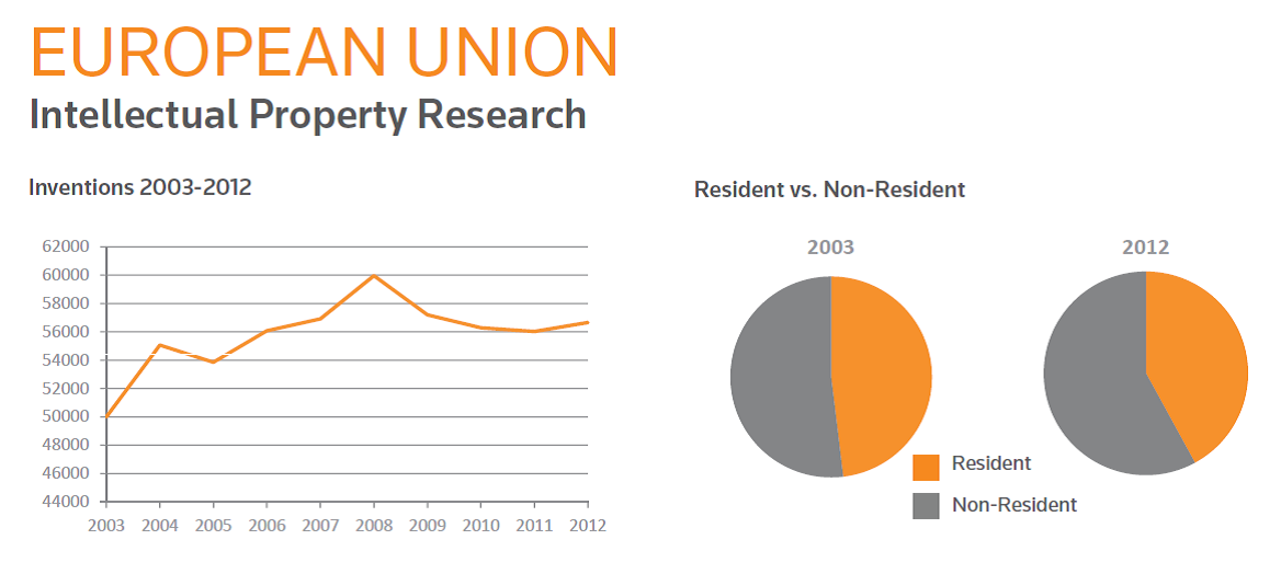 The EU region has been growing quite consistently up to 2008 only to taper off after the 08 GFC period, with new inventions stalling and going sideways the last 2 years.
