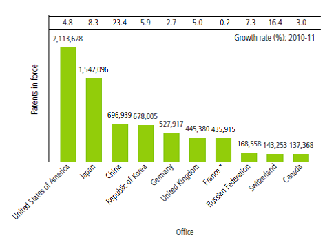 Patents in force top 10 Offices – 2011 (Latest WIPO Data)