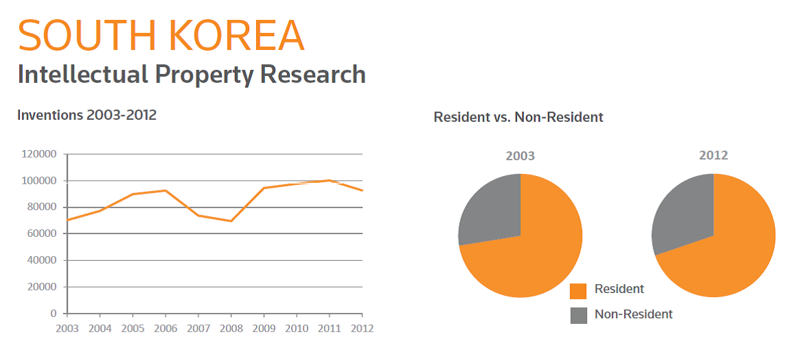 South Korea is home to several large global technology companies like Samsung and LG, the level of new inventions has grown approximately 30% from around 70,000 new inventions a year to around 90,000 since 2003.