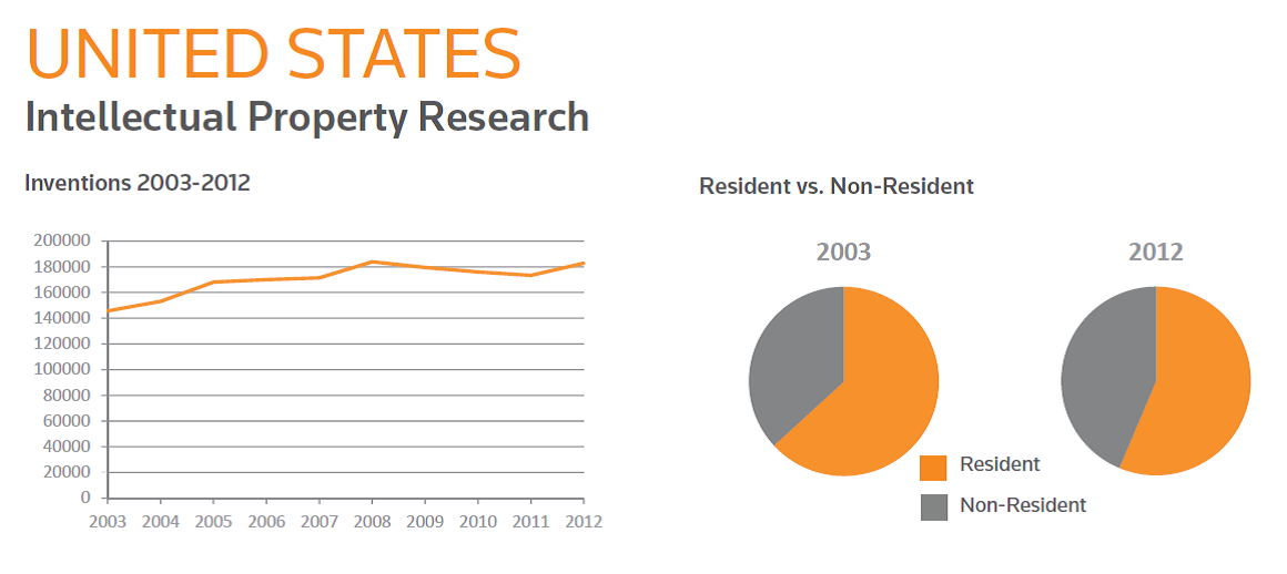 The US is in third place for inventions created, and has been fairly consistent with new inventions growly slowly since 2003.